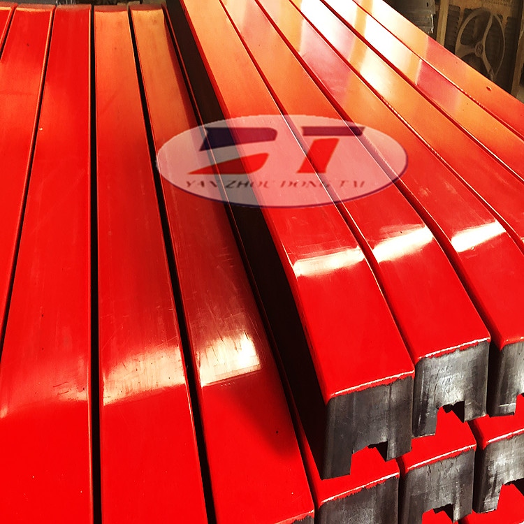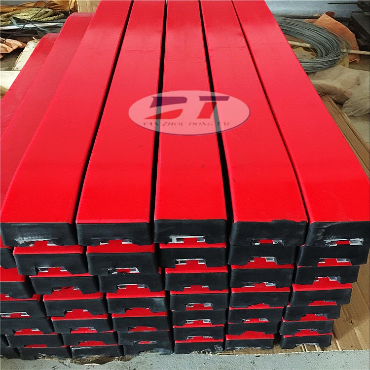 緩沖條耐磨層采用UHMW高分子聚乙烯板材,分子含量高,高于500萬分子量,自潤滑性能好,摩擦系數(shù)小,磨損率低一般不大于0.3,耐磨性能好,使用壽命長,對于特殊復(fù)雜工況,也可以提供920萬超高分子聚乙烯板材的緩沖條,磨損率不大于0.1,更加耐磨。緩沖條的橡膠層,天然橡膠含量高,彈性好,非常柔韌,吸收沖擊能力強,自我清潔功能強。緩沖條采用熱硫化工藝,在高溫高壓狀態(tài)下使高彈性橡膠與高分子聚乙烯板材高強度粘接,牢固可靠,永不分離。