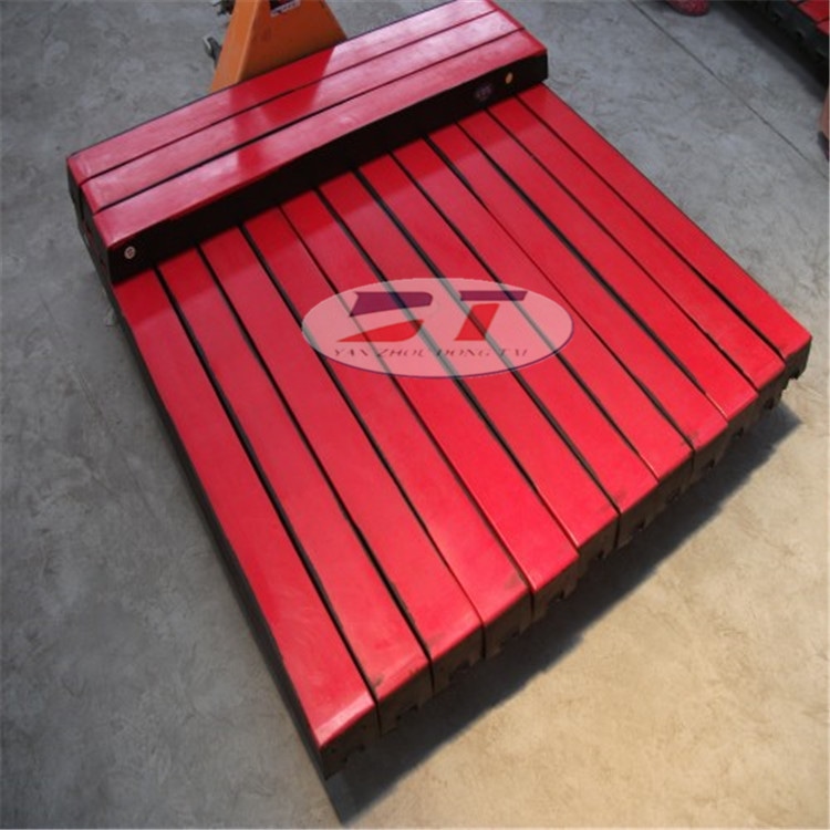 緩沖滑條是緩沖床的重要組成部分,常規(guī)的皮帶機落料點保護裝置為緩沖托輥,在生產過程中緩沖托輥的劣勢不斷暴露出來,緩沖托輥與皮帶機接觸是點與面的接觸,受力不均勻,不但不能保護皮帶機還會加重對皮帶機局部造成更嚴重的損傷。由于緩沖托輥之間間距較大 落料容易卡在托輥中間,托輥停止轉動。緩沖滑條又稱緩沖膠條,由高分子聚乙烯板硫化在天然橡膠條上成型。有些聚乙烯板與橡膠條的連接是采用冷粘粘結,這種緩沖條在落料的重擊下會造成脫膠,開裂。