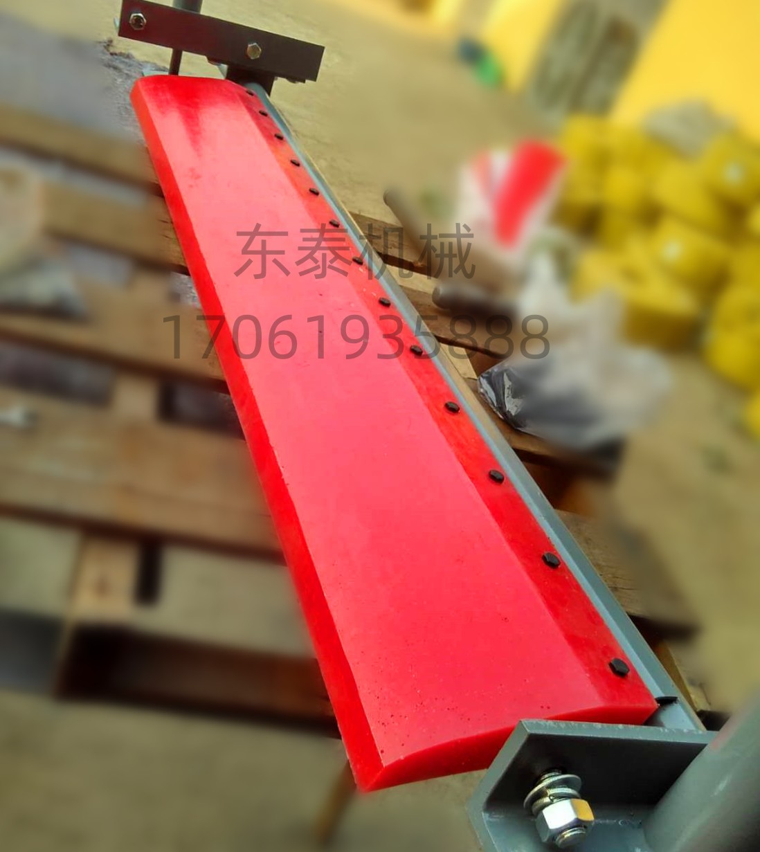 刮刀采用聚氨酯復(fù)合材料,利用模具一體加硫成形,刮刀面平整,直線度好,低摩擦、高耐磨、高強(qiáng)度,具有穩(wěn)定的刮料效果??捎行宄龤埩羝现?xì)粒、濕粘物料。預(yù)壓式調(diào)壓器確保刮刀與皮帶的穩(wěn)定接觸壓力。刮刀面由多塊窄幅聚氨脂刮板組成,具有空形緩沖孔,對(duì)各種皮帶都有良好跟隨性。