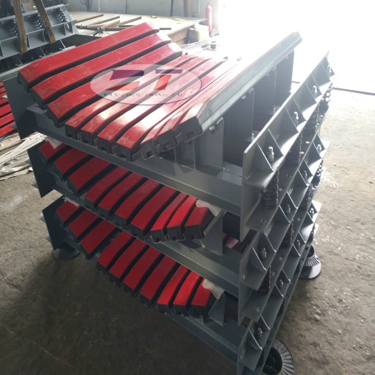 緩沖床主要用于替代緩沖托輥,緩沖床由緩沖條組成,而緩沖條主要應(yīng)用優(yōu)良的高彈性特種橡膠層充分有效吸收了物料下落時(shí)的沖擊力,大大降低了物料下落時(shí)對(duì)輸送帶的沖擊,真正的改善了落料點(diǎn)的受力狀況。并采用特殊的UHMW高分子聚乙烯表面,使輸送帶與緩沖條之間的摩擦系數(shù)降到低,且耐磨性好。緩沖床的使用保證了輸送帶的面與面的接觸,受力均勻,有效防止了由于托輥斷裂、脫落造成的皮帶縱向撕裂,同時(shí)大大降低了皮帶被銳器或尖銳物料穿透后縱向撕裂的概率