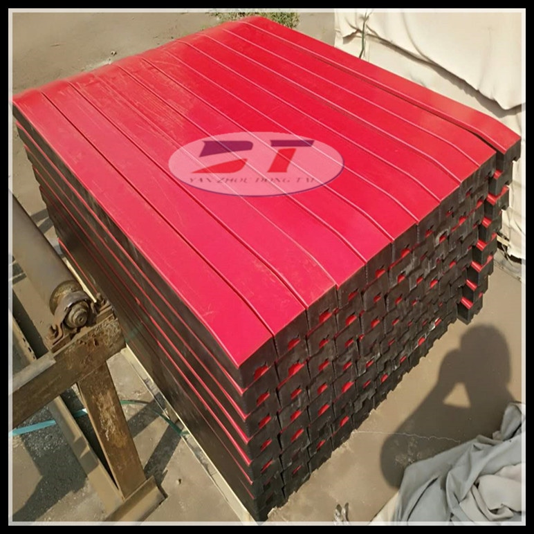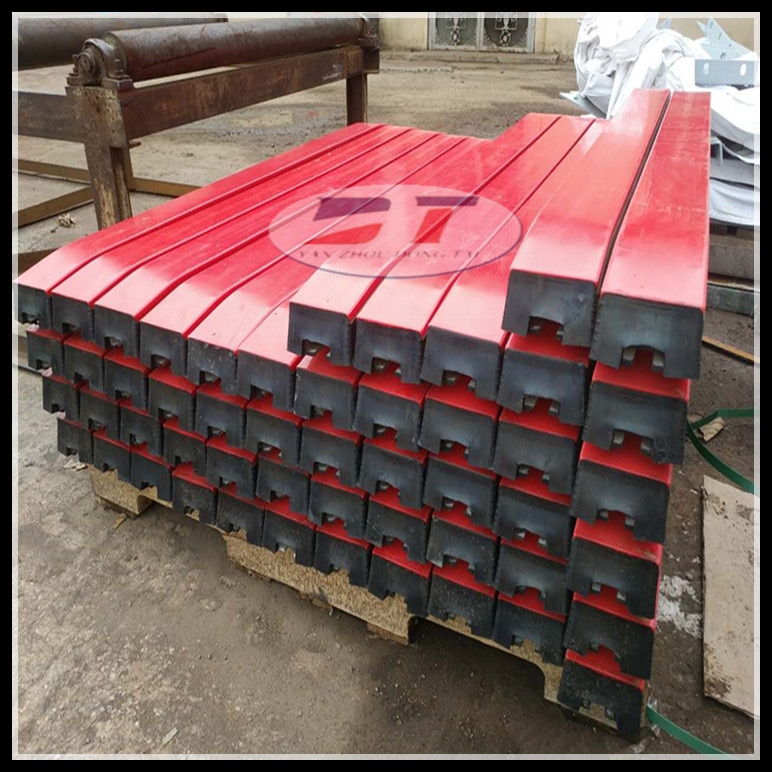 緩沖條各部分粘接采用的是熱硫化設計工藝,將500萬以上超高耐磨材料與硬度小于55的天燃橡膠及鍍鋅鋼構(gòu)一體硫化成型,穩(wěn)定性好、耐磨性好,使用壽命長,結(jié)構(gòu)簡單,易于安裝和維護,在高強度沖擊作用下,不會發(fā)生緩沖條竄條、條體變形或者粘接不牢的情況。緩沖條耐磨層主要指的是超高分子量聚乙烯板,其分子量影響到期性能,不同的分子量影響到耐磨性能、耐沖擊性能一個合適的分子量也會影響到緩沖條性能,對于阻燃抗靜電緩沖條必須采用的是特定的適用于井下專用的材料,這一點與一般的廠家不同,因此品質(zhì)較好。緩沖條表面材料摩擦系數(shù)小、耐磨性好、橡膠彈性高吸收沖擊能量強、獨特鋼結(jié)構(gòu)設計。阻燃緩沖條接觸面的兩端成弧形,有效地保證了輸送帶的平滑運行。獨特的配方和施工工藝確保了緩沖條表層和橡膠的粘接強度。阻燃緩沖條有三部分構(gòu)成,超高分子聚乙烯板,天然橡膠,鋼結(jié)構(gòu)。通過熱硫化的粘接工藝將三部分牢固的連在一起。使阻燃緩沖條在使用過程中不出現(xiàn),開裂,攢條等現(xiàn)象。在落料高的緩沖區(qū)域(轉(zhuǎn)載點)對輸送帶的巨大沖擊力,同時降低輸送帶運行時對輸送帶的摩擦力。